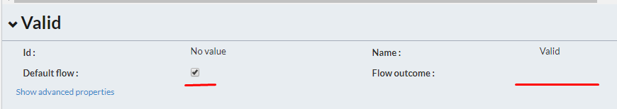 There must be no value selected in the Flow outcome dropdown list for the flow marked as default.
