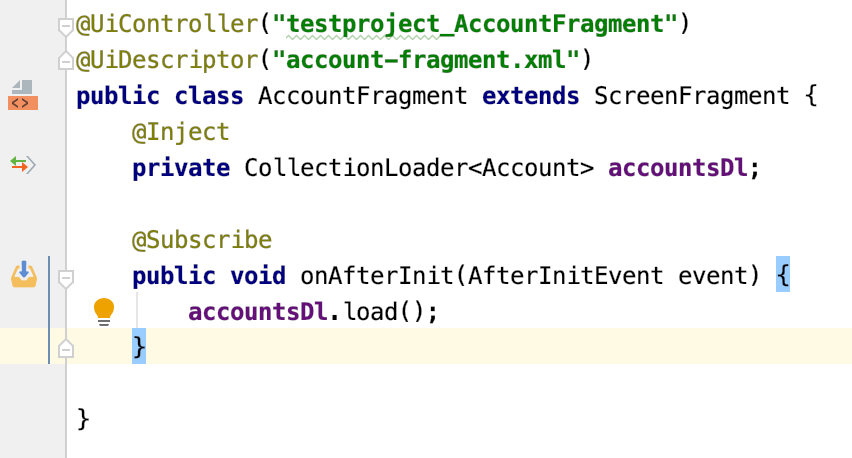 Currently you refer it from the fragment, however it is not declared neither in the main screen nor in the fragment. Where do you want the accountsDc to be loaded, in the fragment itself or provided from the main screen?